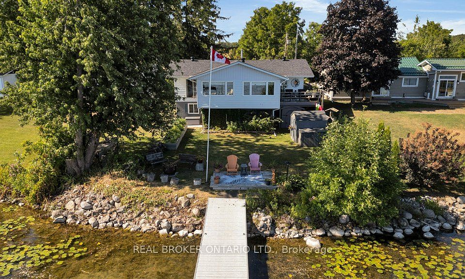 Spectacular waterfront home minutes to Orillia on Lake Couchiching! With 5 car parking you will be impressed before you even step inside. The flat usable property is perfect for a game of horseshoes, a bonfire, growing your vegetables or relaxing after a day out on the boat. There is an upper balcony to take in the views, a lower screened in party room, a deck right at the waters edge and a 48-ft long composite dock perfect for all of your visiting friends. Once inside the carpet free home you will be impressed with the wood kitchen with stove facing the lake. Can you imagine cooking meals while taking in the tranquility of the lake?! The 4-piece guest bathroom is tucked away by one of the guest bedrooms with front den with crown moulding and keyless entry. The main open living, dining space with wood stove (2022) has hardwood flooring and crown moulding with views of the lake. Into the bonus sunroom through the French doors boasting cathedral ceilings, natural gas fireplace (2020), views for miles, and sliding door to the deck perfect for your morning coffee or to bbq in the evenings. The primary suite is in it's own wing of the house with Juliette sliding doors facing the lake, hardwood flooring, crown moulding, huge walk-in closet and 4-piece ensuite (2024) with quartz countertops, sauna (2024) and stand up shower with rain shower head. The lower walk-out level boasts a 3rd rec room, 3rd bedroom and laundry. 7 minutes to major box stores, 1 minute from Hwy 11. Septic bio-filter (2014), windows (2014) uv system (2022), waterproofing (2025), furnace (2012), electrical panel (2012), roof (2018), sunroom flooring (2020), sump pump (2025), jet pump (2019), owned hot water heater (2023), uv system (2023).