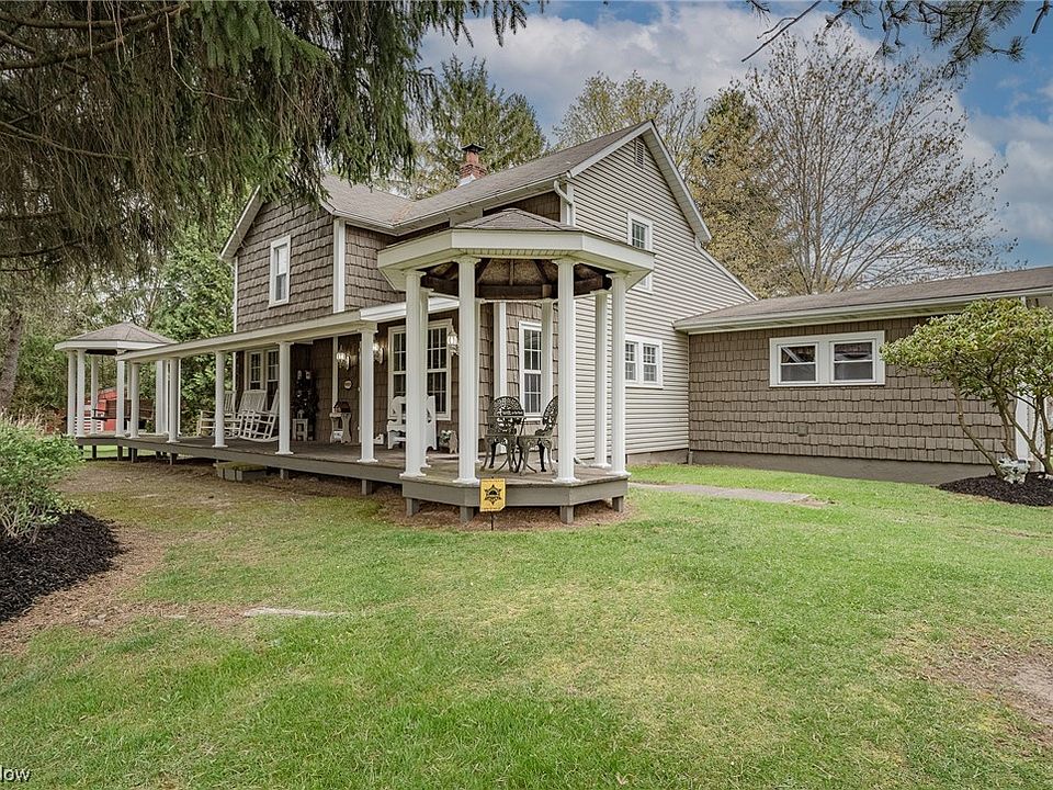 One of a kind opportunity for a lovely colonial on 3.8 pristine acres in Chagrin Falls with a barn, two spring fed ponds, a cabin, outbuilding, and more! Inside the home, there are 3 bedrooms, 3 updated full bathrooms, spacious open-plan living areas, and a lovely loft that could easily be converted to a 4th bedroom. The front door enters into a cozy enclosed porch that opens into the eat-in kitchen. Here you will find a full complement of appliances, a breakfast bar, granite and ceramic countertops, and a spacious dining area. The dining area is open to a stunning family room that features a wood-burning fireplace and sliding doors to the back deck and breezeway. French doors open from the dining area to a laundry room, a full bathroom, and access to a storage room and the attached 2-car garage. On the other side of the home, there is an updated living room that connects to the owner's suite. Here you will find a very spacious bedroom with a generous walk-in closet and a luxurious ful