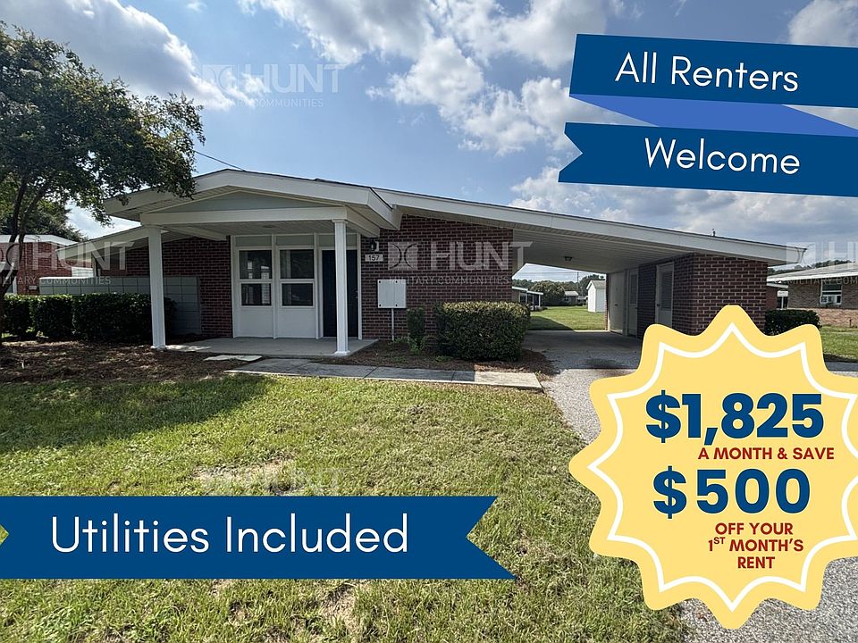 Discover this charming brick-built ranch-style home in the welcoming Laurel Bay Community. This 4-bedroom, 2-bath home features a large kitchen, screened-in back porch, and carport, with the living and dining room flowing directly off the kitchen for a comfortable layout. Best of all, electricity, water, and air conditioning are included in your monthly rent, making this home an unbeatable value at $1,825/month, plus $500 off your first month's rent!