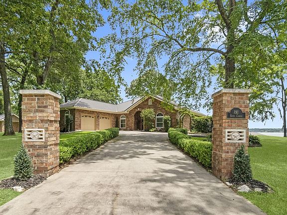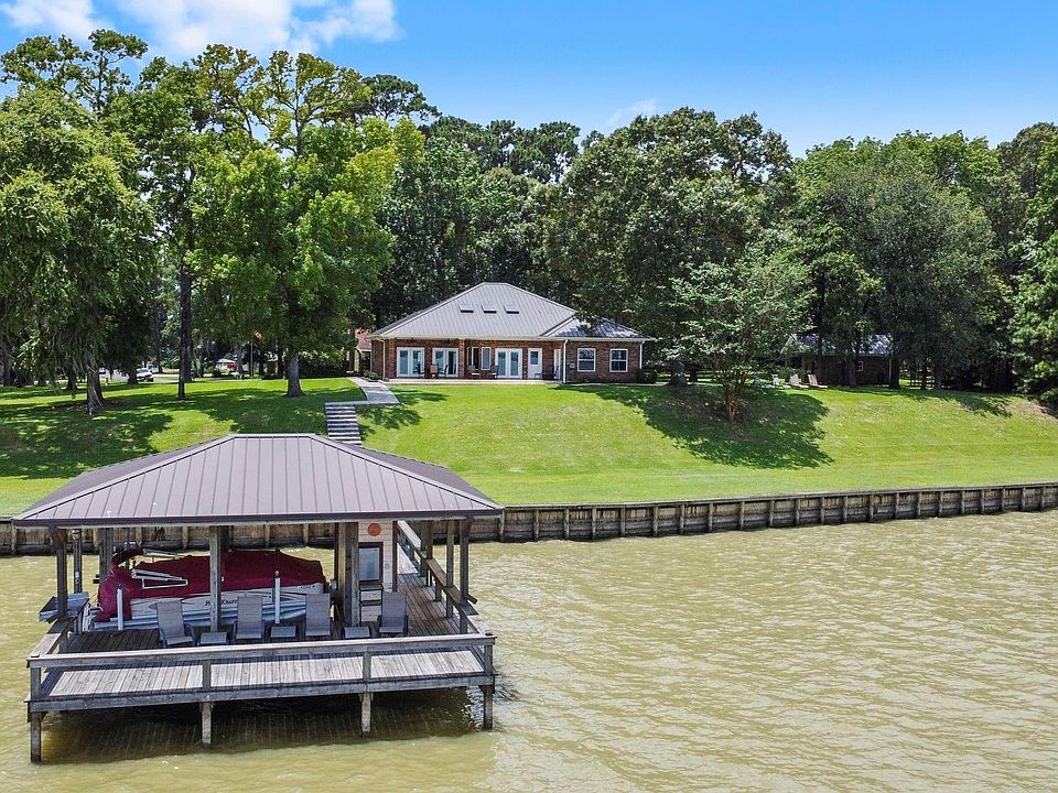 Welcome to your private waterfront retreat on the banks of Lake Livingston, where every day feels like a getaway! Tucked beneath mature trees at the end of a quiet cul-de-sac, this 1-story brick beauty sits on 4 lots, nearly 2 acres stretching all the way to the water’s edge w/approx. 440 ft of bulkheaded shoreline. Inside, find timeless design & luxurious living w/custom finishes, soaring ceilings w/chic lighting & fans & stunning water views from nearly every corner. Island kitchen, open living & dining areas, flex/study + 3 roomy bedrooms offer ample space for comfortable daily living & easy entertaining. Energy-efficient geothermal A/C & heat keep this home comfortable year-round, while a 12-zone sprinkler system keeps this expansive lawn looking its best. Unwind on the covered patio, fish from your private pier & 2 boathouses w/lifts, or tinker in the fully finished craft/project building. From early-morning fishing to sunset gatherings, this is waterfront living at its best.