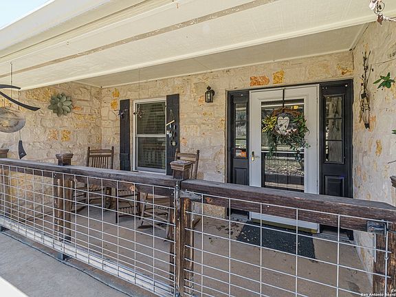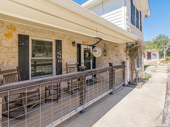 Nestled at the end of a quiet cul-de-sac, this stunning stone home sits on nearly seven acres, offering breathtaking long-range views and the tranquility of nature-just minutes from Main St. in Fredericksburg, Tx. A welcoming front porch invites you to sit and rock the day away before stepping into the foyer, where a traditional yet spacious floor plan unfolds. The main level features a formal dining room, kitchen, laundry room, master suite as well as a fourth bedroom with an adjoining full bath, which could alternatively be used as home office or additional entertaining space when its French doors are opened. The updated gourmet kitchen boasts custom wood cabinetry, including wine and spice racks, an appliance garage, pop-up mixer shelf and built in recycling bins. Granite topped island includes amazing work space and seating for casual dining. Handcrafted blown glass light fixtures by Garcia Art Glass complement the warm tones of the granite and hand-laid tile accents. A charming bay window is the perfect spot for your favorite plants or fresh herbs. Tucked away for privacy, the master suite offers a peaceful retreat with a spa-like ensuite, featuring a soaking tub and separate shower. A Toto bidet with a heated seat and sensor adds a touch of luxury. The cozy family room is the highlight for gathering friends and family complete with a wood-burning fireplace, custom bookshelves, and large windows that frame the natural beauty of the surrounding hills. Upstairs, two spacious bedrooms have abundant natural light and share a Jack and Jill bathroom design. A walk-in attic provides easy access for storage, perfect for seasonal decor. Main level utility room includes washer/dryer hookups, built in shelving, cabinets and an additional water outlet for an optional sink. Step outside onto the expansive deck overlooking the acreage and pond where you can take in breathtaking sunsets. The fenced yard is ready for pets and the attached additional guest suite serves as fifth bedroom that adjoins the main house with a separate entrance, its own HVAC unit, and full bath- ideal for guests or extended family. Beyond the home, this property offers exceptional outdoor features, including two storage sheds, a covered carport with space for two vehicles, EV outlet, and separately built studio equipped with water and HVAC. This versatile space is perfect for home office, art studio or additional guest quarters. This Texas Hill Country masterpiece combines comfort, functionality, and timeless charm in a peaceful setting. Welcome home to the Texas Hill Country.