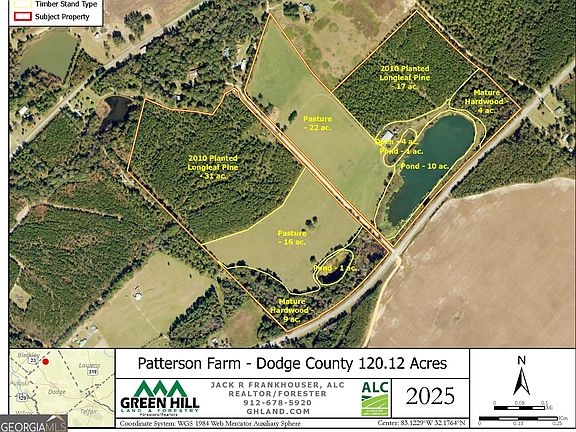 The Patterson Farm is a rare offering featuring beautifully maintained pastures, majestic Longleaf pines, and a stunning 10-acre pond stocked with trophy bass. Conveniently located in Dodge County, Georgia, the property sits just 10 minutes from Cochran and a short drive from Interstate 16. At the heart of the farm is the scenic 10-acre pond, providing both a breathtaking vista and excellent fishing opportunities. The gently rolling terrain and 38 acres of lush pastureland create incredible views and multiple prime homesites. These pastures are in outstanding condition and well-suited for horses, cattle, or other livestock. Multiple wells across the property, along with the pond, provide convenient water sources for livestock or future homes. Adjacent to the pond stands a large 60' x 100' steel barn, currently used for hay and equipment storage. This versatile structure could also accommodate a camper or be partially enclosed and finished into a living space or barndominium. The property also includes 48 acres of 15-year-old pine enrolled in the CRP Program. Utilities and connectivity are a great feature of Patterson Farm. The property is serviced by Ocmulgee EMC, with multiple overhead utility lines ensuring excellent electrical access across the tract for wells, barns, and other improvements. High-speed fiber internet is also available, providing reliable connectivity for streaming, business, or remote work. This is a truly special opportunity to own a highly versatile farm property offering beauty, recreation, and income potential. Don't hesitate to contact our team today to schedule your private showing.