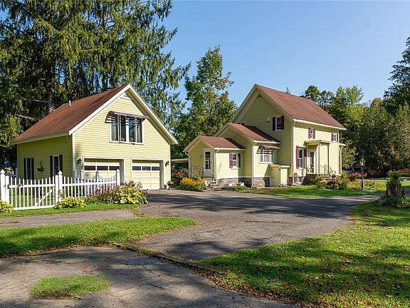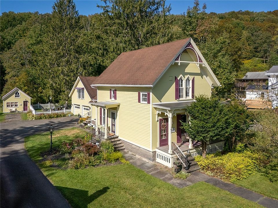 Set in the picturesque village of Andes, this striking Grand Dame Victorian showcases the rich decorative elegance of the Gothic Revival movement. Hallmarked by its signature pointed arches repeated throughout windows, doorways, and ornamental trim, the home features a steeply pitched cross-gabled roof and an inviting one-story porch — classic elements of the style’s romantic architecture.