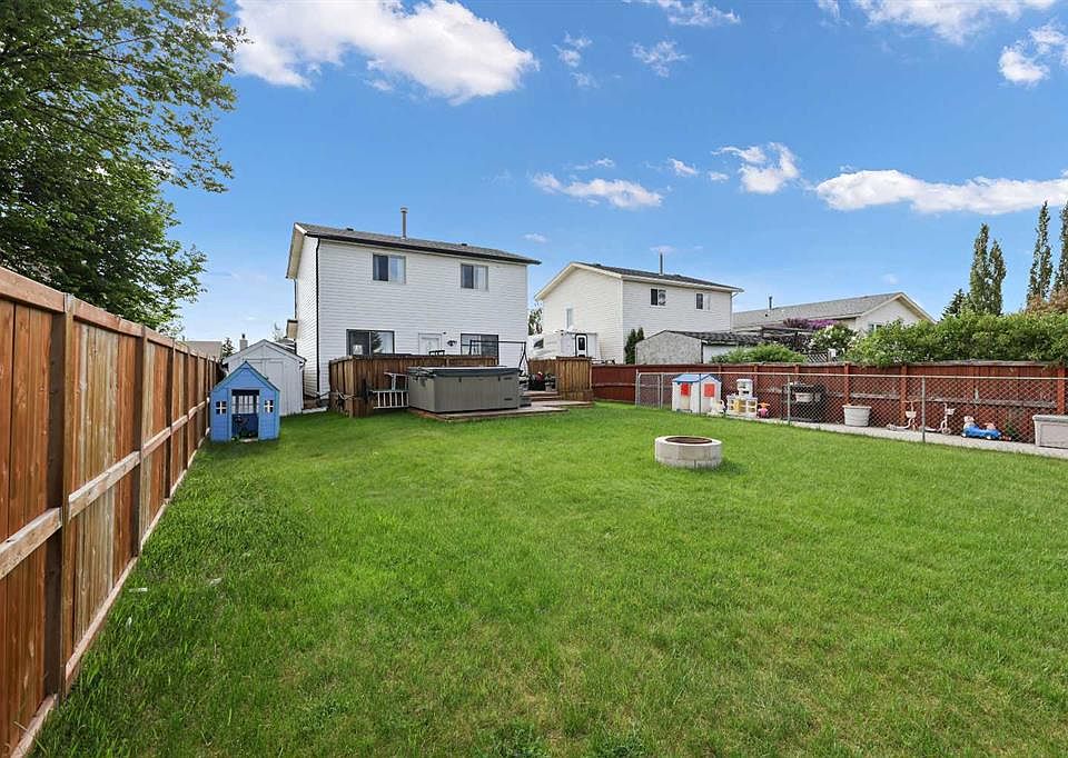 This beautifully maintained and upgraded home sits proudly on a generous 43 x 141 ft deep lot, offering space and lifestyle you’ll love. Formerly run as a licensed day home, it presents a unique opportunity for the next owner to make it their own. Step inside to be welcomed by gleaming laminate floors and an abundance of natural light pouring through the oversized windows. The bright and airy living room, anchored by a large picture window, flows seamlessly into the spacious dining area—perfect for family gatherings or entertaining with ease. The kitchen is a standout with its rustic knotty pine cabinetry, stainless steel appliances, tile backsplash, and handy side island with extra storage. From here, a garden door leads you out to a true backyard retreat: a massive west-facing yard with no neighbors behind, featuring a large deck, hot tub with two brand-new motors, three storage sheds, play structure and sand pit, fire pit area, playhouse, and even a concrete parking pad. Upstairs, you’ll find three comfortable bedrooms and a stylishly updated 4-piece bathroom complete with tile flooring and a tiled tub surround. The mostly finished basement expands your living space with a large rec/family room, fourth bedroom, laundry, storage, and rough-in plumbing ready for future customization. This home comes loaded with updates for peace of mind: furnace, hot water tank, and A/C (2010), roof shingles and siding (2022), and fresh gravel driveway (2021). All of this is in a prime location—steps to schools, parks, shopping, restaurants, and the always popular Prairie Winds Park. Quick connections to McKnight, 64th Ave, 36th Street, and Metis Trail make commuting a breeze.