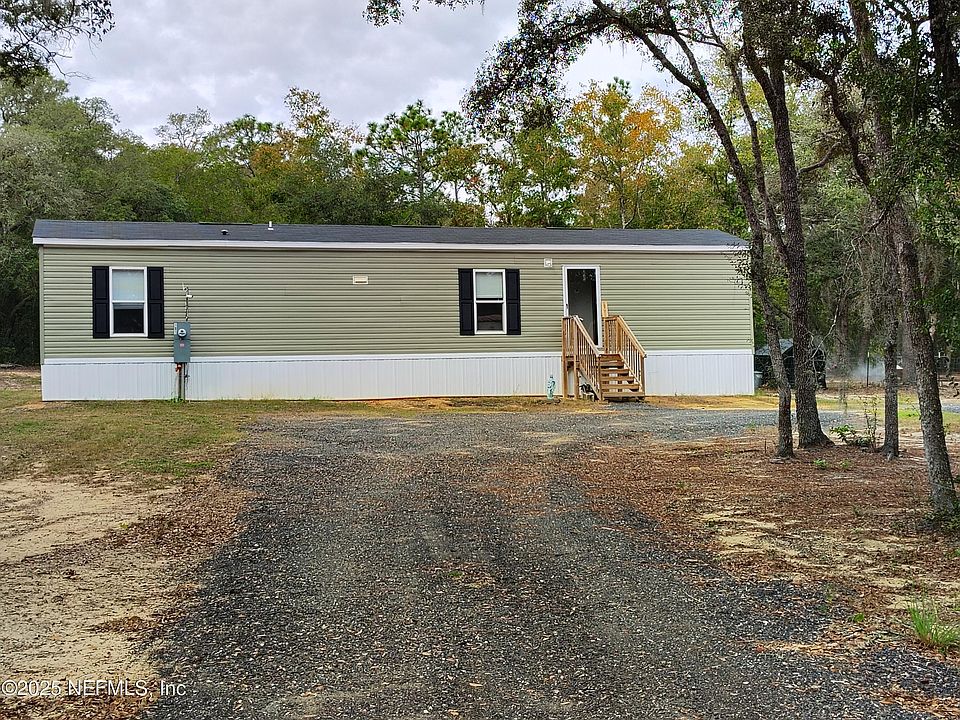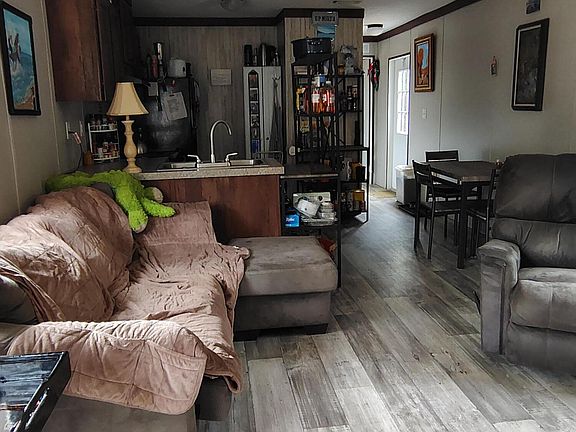 Looking for quiet and privacy, this home is for you! 2023 Mobile Home on a nice large lot, Split floor plan 2/2. Enjoy the partially cleared lot with metal building and covered shed. Inside the metal building is an office area with AC. The area with the shed is fenced for pets and has a nice sitting area under the big oaks. Additional