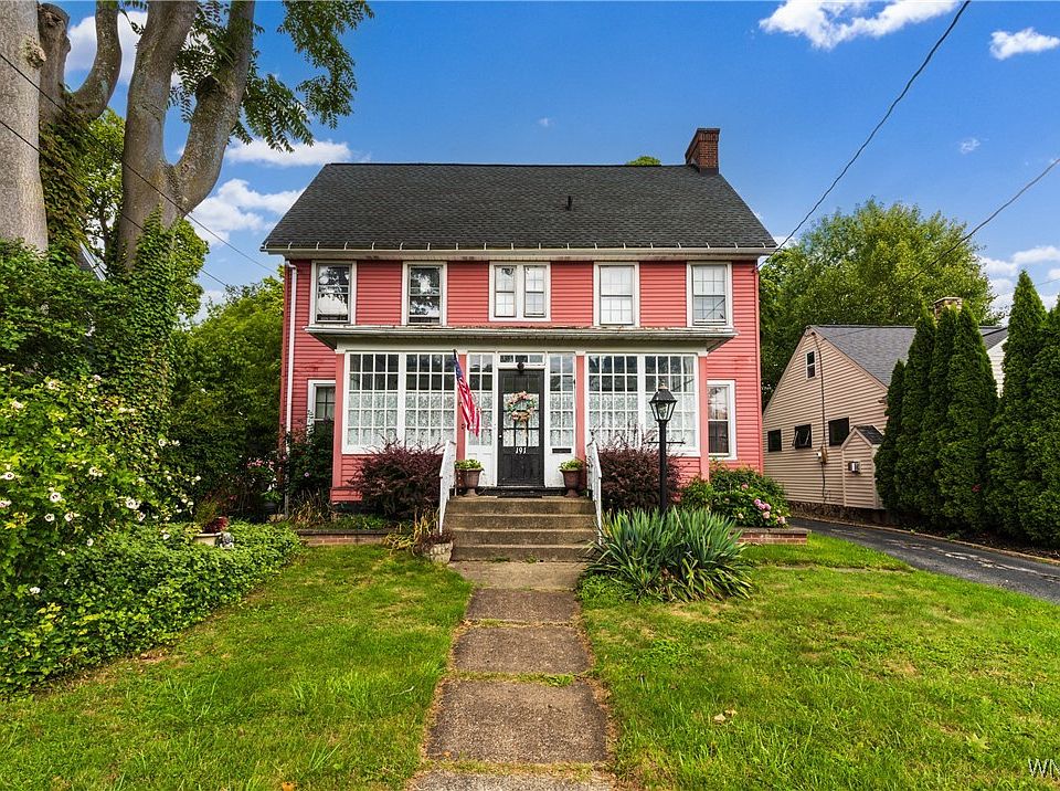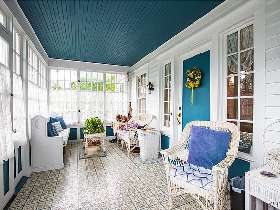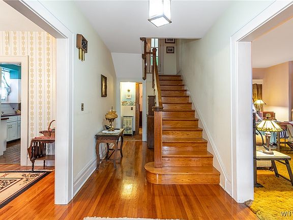Classic four-bedroom center entrance colonial on desired street in Hamburg Village with a short walk to Main Street, restaurants, churches, schools, parks and playgrounds. A glass windowed entry porch provides three seasons of enjoyment. Original hardwood floors throughout have been refinished in most rooms. Custom wood cornices accent the living and dining room windows. The kitchen has a cozy benched eating area. Central stairs lead to an elevated family room with large arched windows overlooking mature perennial gardens. Additional features of the family room include a wood burning stove, a custom-built wall of storage and display shelves and a custom-built window storage bench. There are four bedrooms on the second floor with a bonus bedroom and play area on the full third floor. The double car garage has a newer door opener (2023) with built-in Wi-Fi, camera and battery back-up.