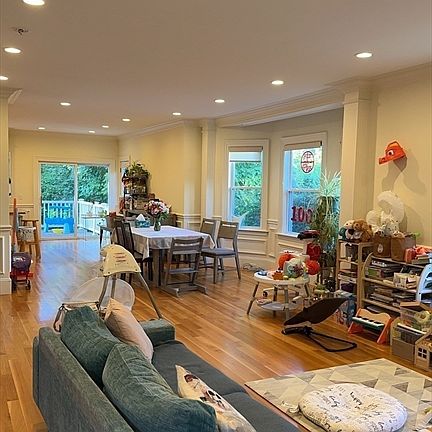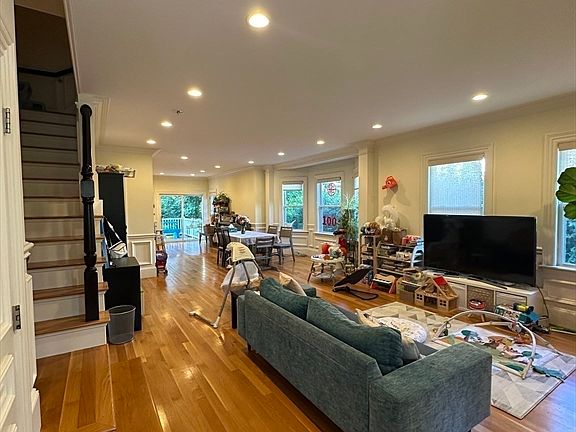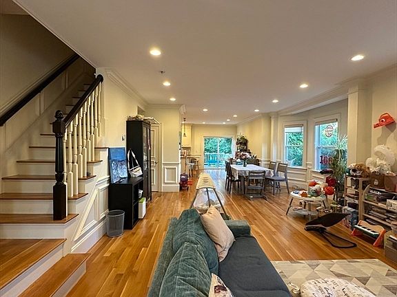 In the heart of desirable Newtonville Village, this stunning townhouse-style condo, gut-renovated in 2014, offers 4-bed/ 4.5-bath, and over 3,200 sq. ft. of finished living space across 4 levels. Every room features recessed lighting, rich mouldings, and high ceilings. The main level boasts an open floor plan with a living room featuring a gas fireplace and custom mantle, a spacious dining area, a half bath, and a custom chef's kitchen with an island and access to the back deck. The second floor includes a master suite with two walk-in closets and a marble bath, a second bedroom, a full tiled bath, and laundry. The top level offers two additional bedrooms and another full bath. The expansive finished lower level includes a gas fireplace, custom built-ins, a full marble bath, utility closet, and walk-out access to a large yard. Outdoors, enjoy a garage, driveway parking, and proximity to the commuter rail, highways, shops, restaurants, and parks.