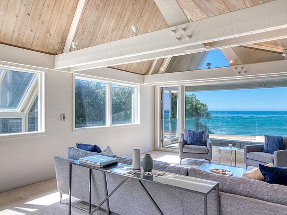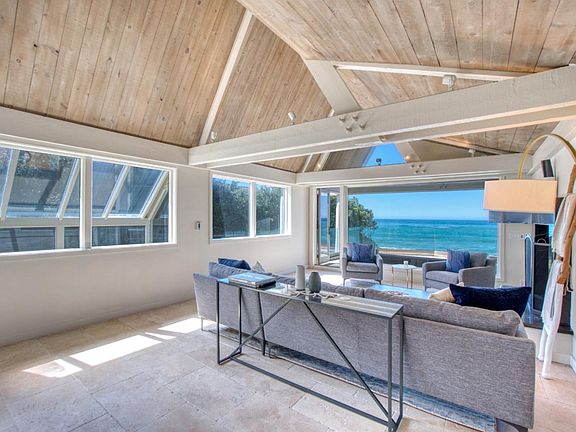 This quintessential beach house with direct access to the sandy beach is rare for San Mateo County. This exceptional property also is wind protected in the way it is situated & features a leeward side deck complete with stone outdoor gas fireplace. The outdoor hot tub overlooking the beach & ocean also has 2 fire pits. The putting green will amaze you. The interior is nicely updated with a master suite featuring a fireplace, spacious bathroom & walk-in closet. The second master bedroom is located on the lower floor & has direct access to the sand and entertainment area. Warm Floors radiant heat is zoned for efficiency.The granite kitchen counters & island open to the family room. Every room with the exception of the master suite offers beach & ocean views. The tall ceiling with exposed beams in the living room provides a majestic view, & the fireplace adds warmth. This is a must see opportunity. The home is set back from the tidal break sufficiently & is landscaped with native plants.