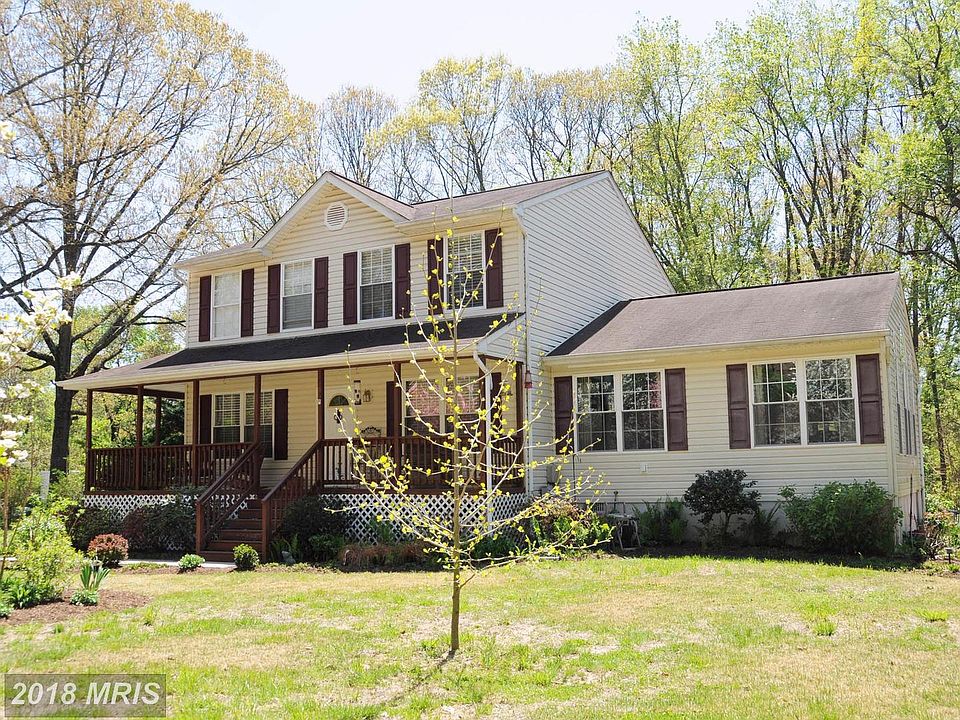 Private location. Spacious colonial with wrap around porch and detached garage which was converted into a studio. Kitchen with granite counters and large adjacent dining room. Over sized family room addition with cathedral ceiling and separate heating/cooling.Front living room and den. Master suite with large walk-in closet and private full bath.Rear patio overlooking the yard and woods. Must see!
