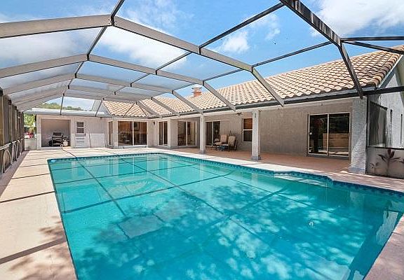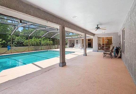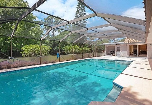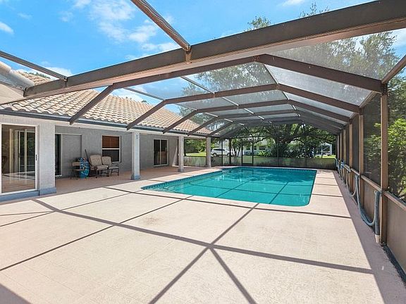 Spacious family home w/large screened in pool and covered patio, perfect for summer cookouts. Patio space includes cooking area w/ electric & water hookup, also a cabana bath. Pool deck recently resurfaced. Quiet neighborhood on a dead end street. Sits on almost an acre of land with lush landscaping. Natural light thru-out from sliders across the rear of the house, giving a great view of pool & patio. Laminate wood and tile flooring. Master Suite is a spacious private retreat with roman tub, walk in closet and dual sinks. Next to the master is an additional room that could be used as a nursery/office or craft room. It has the 1/2 bath. 2 living rooms w/cathedral ceilings, one has a fireplace Central kitchen opens up to both living rooms and dining area with pool/patio views. Attached shed/storage would be perfect for a workshop. Laundry room has a sink. Central intercom system as well as central vac. There is a security system in place. Besides the garage there is a circular driveway for parking. Set up a tour today!