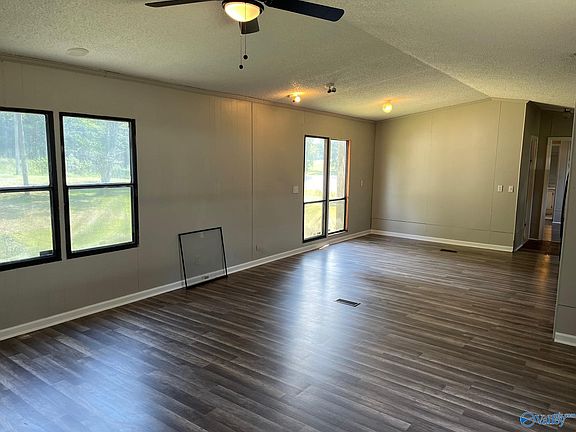 Just remodeled! 2 bed 2 bath mobile home in Union Grove- 25 minutes to South Huntsville, 25 minutes to Guntersville, 5 minutes to Arab. New LVP flooring ( NO CARPET), paint, plumbing, counters and light fixtures. Primary bedroom has attached bathroom with additional storage area for a hanging rack or dresser. Central heat and air. Fridge, stove/range all included. Washer/dryer hookups in HUGE laundry room. Lawn care, water, and trash services are all included. Living room has a pretty view of pond across the road. Pets on case by case basis with breed restrictions, pet fee at signing, and $25 per month pet rent.