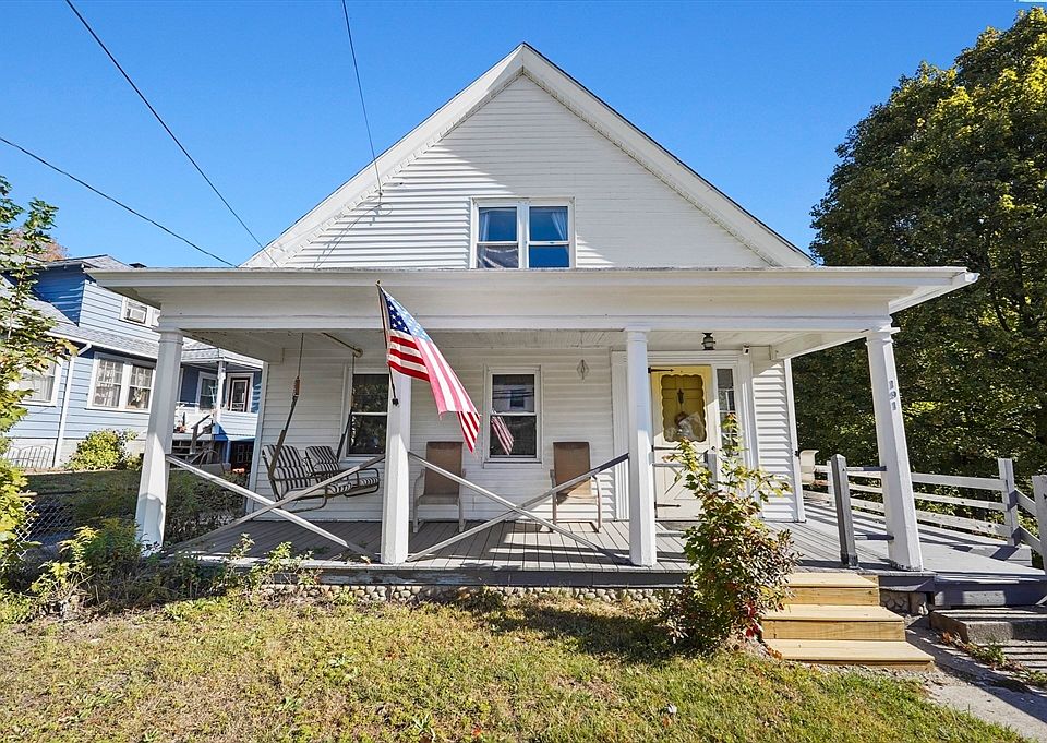 Once inside, you’ll be greeted by a spacious, inviting living room w/ HW floors. The kitchen features a classic farmhouse-style sink & butler’s pantry. A formal dining room w/ a pellet stove provides the ideal spot for gathering. The 1st floor also includes a convenient bedroom, full bath & laundry hookups. Upstairs, the primary boasts HW floors & a walk-in closet. Two addit'l bedrooms offer plenty of closet space & the full bath features a clawfoot soaking tub for a touch of vintage charm. A sunroom off the kitchen leads to a deck overlooking the yard. Recent updates include the removal of old knob-and-tube wiring, replaced w/ modern Romex electrical, new sewer line (2021) & a new heating coil installed in the furnace (2020). The paved driveway & garage add everyday convenience, while the backyard offers a surprise—cross the stream to find a cleared, fenced-in area surrounded by trees for natural privacy. Just minutes from downtown shops, restaurants, and seasonal festivities!