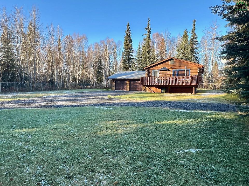 This attractive log and cedar sided home has the perfect blend of privacy and convenience. Situated on almost an acre of land giving the feeling of serenity, yet only 3 minutes from the grocery store and less than 8 minutes to the airport and UAF. The main living area and primary bedroom have vaulted T&G ceilings, creating an open and inviting feel. The spacious floor plan of the living room and kitchen and easy access to the large deck are perfect for gatherings with family and friends. The beautiful and newer woodstove is ready to provide warmth and ambiance during the cold winter nights. An oversized 2 car garage gives ample room for vehicles and storage. There is an additional parking area for your RV, trailers, etc.