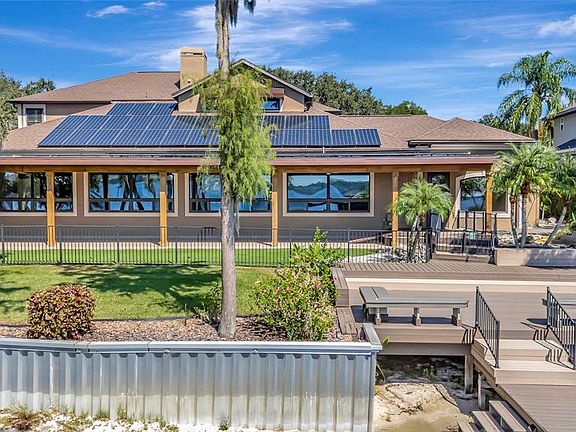 Welcome to your own piece of lakefront paradise in Clermont’s highly desirable Margaree Gardens neighborhood. From the moment you arrive, you’ll be drawn in by the excellent curb appeal, lush mature landscaping, and the majestic oak tree that graces the front yard—setting the tone for the beauty and serenity that continue throughout this home. Step inside, and you’ll immediately feel the warmth and comfort of this inviting four-bedroom, four-and-a-half-bath residence. The spacious floor plan is designed for both easy everyday living and effortless entertaining. A grand formal foyer welcomes you with natural light and leads to elegant spaces that flow seamlessly together. The formal dining room, highlighted by a cozy fireplace, is perfect for hosting gatherings, while the private office with custom sliding wood doors offers a quiet place to work or unwind. At the heart of the home is a beautifully appointed kitchen, featuring an oversized granite island, matching backsplash, and a layout that opens directly to the family room. With a double-sided fireplace, built-in entertainment center, and hardwood floors, this space feels both comfortable and refined. Toward the back of the home, a large multipurpose room provides plenty of flexibility for a game area, gym, or additional dining space—all while offering tranquil views of the lake. The primary suite, conveniently located on the main level, serves as a relaxing retreat with dual vanities, a Jacuzzi tub, a spacious walk-in shower, and generous closet space with closets on either side of long hallway. Upstairs, three large bedrooms each feature their own fully remodeled ensuite bathrooms (completed in 2025)—making it ideal for family and guests alike. Every detail of this home has been carefully maintained and thoughtfully upgraded. Notable improvements include a fully paid solar system with battery backup, mosquito misting system, automatic screen for the boat lift, gutter guards, custom bar, new carpet upstairs, new porcelain tile in the Florida/game room and primary suite, plantation shutters, pet friendly turf in backyard, new windows (installed in 2020), water softener system, and a 90-gallon energy-efficient hot water heater. The kitchen appliances are newer as well, with the refrigerator and dishwasher replaced just last year. Car enthusiasts and hobbyists will love the three-car garage plus an additional oversized fourth garage with soaring ceilings and epoxy flooring—complete with an outlet for an electric car charger. Step outside and discover what truly makes this property special. The expansive back deck leads down to a fully covered boat dock, perfect for fishing, entertaining, or evening cruises on the Clermont Chain of Lakes. A spacious covered porch overlooks the beautifully landscaped, fenced backyard that’s ideal for family gatherings or simply relaxing in your private outdoor retreat. Perfectly situated within the City of Clermont, this home offers the best of both worlds: the peace and beauty of lakeside living just minutes from the charming shops, restaurants, and community events of downtown. From sunrise paddleboarding to evenings spent watching the sunset from your deck, this is a home that celebrates Florida living at its finest. Don’t miss the chance to make this one-of-a-kind lakefront retreat your own!