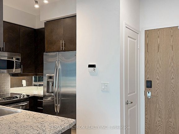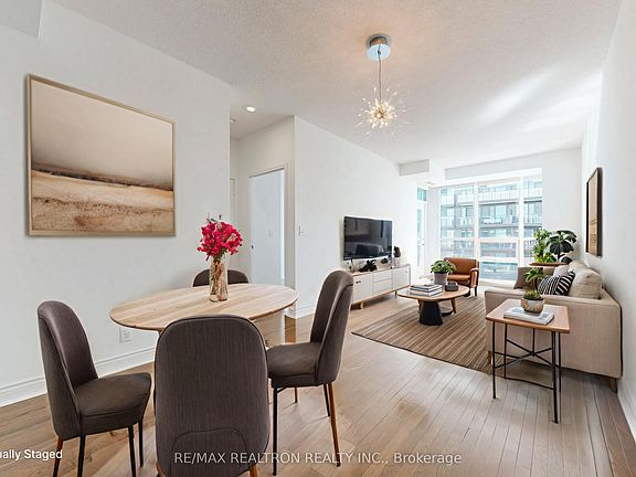 Gorgeous lower penthouse 650 sq ft suite at Park Lake Residences with stunning southwest view of lake. Spacious open space living / dining room. Access to the balcony from king sized bedroom & living room. Superbly appointed with 9Ft Ceilings, high end finishes including tall wooden kitchen cabinets, granite counters, mirror & SS backsplash, SS appliances including 36 double door fridge, solid oak floors throughout, spa-like bathroom with marble tiles, Kohler sink, Toto toilet, brand new top of the line high capacity LG washer/dryer (2024), custom blinds & lighting, alarm system, balcony tiles, swipe card unit access. Premium parking with large locker room beside the elevator. Quiet posh building with 9 suites per floor. Served by 4 transit lines & 15 minutes to Downtown Toronto. Walk to Sunnyside Beach, High Park, roller blade, bike or stroll the Martin Goodman Trail & more. Excellent amenities including 24-hour Concierge, gym, yoga/ ping-pong room, cards/ billiards room, meeting and party room, rooftop serenity garden with BBQs, picnic tables & amazing views of the Lake and visitor Parking. The unit is presented with a few virtually staged pictures as well as vacant. See attached 3D tour for a virtual walkthrough! Everything is done! Just move in & enjoy!