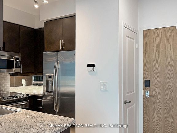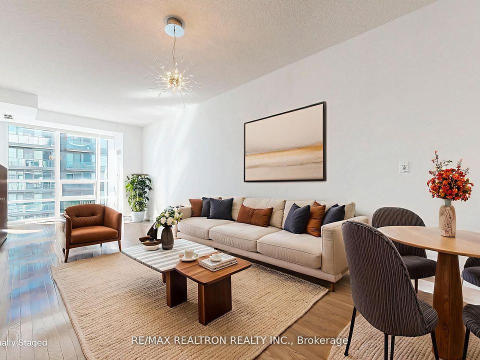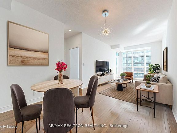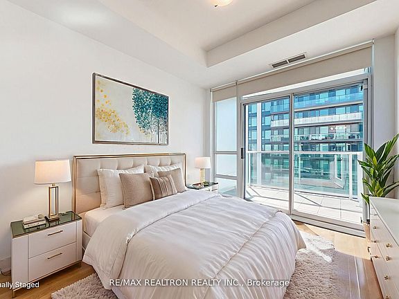Gorgeous lower penthouse 650 sq ft suite at Park Lake Residences with stunning southwest view of lake. Spacious open space living / dining room. Access to the balcony from king sized bedroom & living room. Superbly appointed with 9Ft Ceilings, high end finishes including tall wooden kitchen cabinets, granite counters, mirror & SS backsplash, SS appliances including 36 double door fridge, solid oak floors throughout, spa-like bathroom with marble tiles, Kohler sink, Toto toilet, brand new top of the line high capacity LG washer/dryer (2024), custom blinds & lighting, alarm system, balcony tiles, swipe card unit access. Premium parking with large locker room right beside the elevator. Quiet posh building with 9 suites per floor. Served by 4 transit lines & 15 minutes to Downtown Toronto. Walk to Sunnyside Beach, High Park, roller blade, bike or stroll the Martin Goodman Trail & more. Excellent amenities including 24-hour Concierge, gym, yoga/ ping-pong room, cards/ billiards room, meeting and party room, rooftop serenity garden with BBQs, picnic tables & amazing views of the Lake and visitor Parking. The unit is presented with a few virtually staged pictures as well as vacant. See attached 3D tour for a virtual walkthrough! Everything is done! Just move in & enjoy!