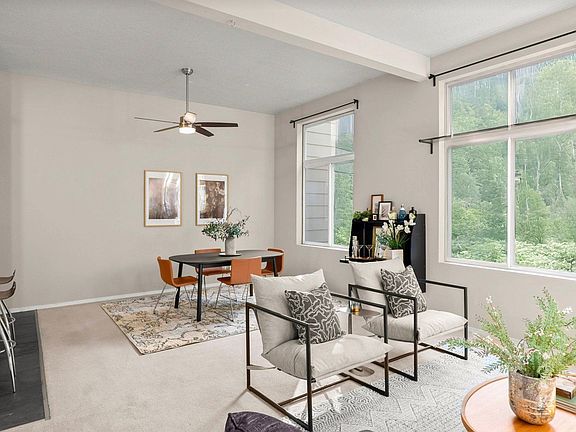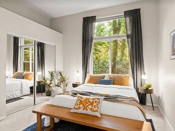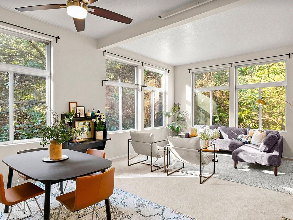 A quiet haven nestled in greenery but filled with light. 12ft ceilings and tall windows surround a huge living-dining space. Kitchen has breakfast bar with marble countertops. Two quiet bedrooms, each with their own private bathroom. Enormous rooftop deck with stunning views of the city and Mt St Helens. Washer and drier in unit.