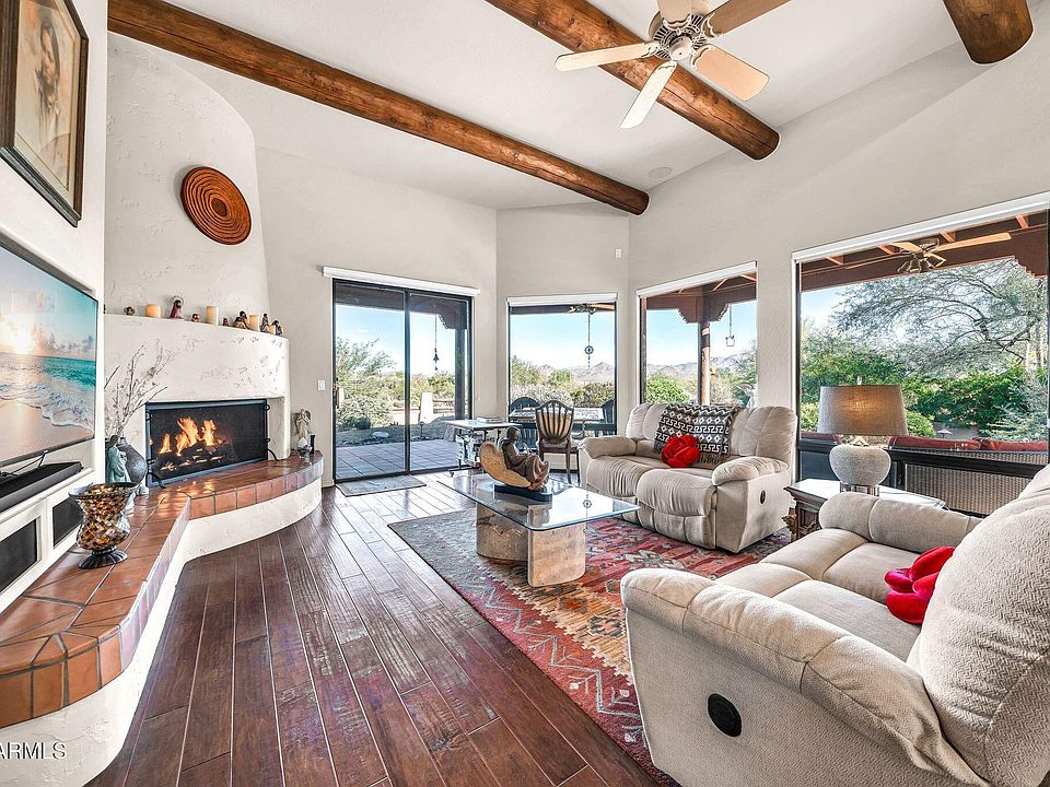 Huge covered patioOutdoor woodburning kiva fireplaceBeautiful wood beamsHigh ceilingsPanoramic mazatzal mountain viewsWater feature