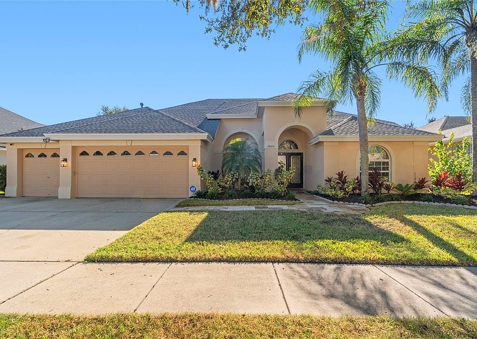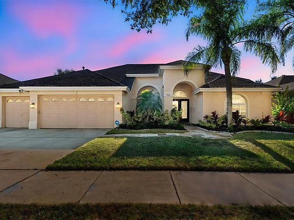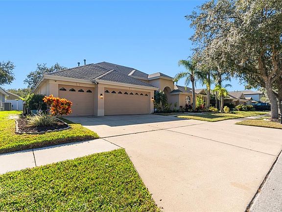 Welcome to your peaceful and serene oasis nestled under mature tropical landscaping on a quiet cul-de-sac street lined with majestic mature oaks. This stunning Nohl Crest home features 5 bedrooms, 4 bathrooms, a 3-car garage and a luxurious pool package and is located in the highly sought after gated village of Hawthorne Estates in West Meadows. The home landscaping and travertine walkway to the double-etched glass front door create a fabulous curb appeal. This home is sparkling clean and MOVE-IN READY! Inside, gorgeous marble floors are complemented by a serene color palette and upgraded light fixtures, creating an elegant and sophisticated ambiance. The very spacious and bright gourmet kitchen features maple cabinets with moldings and a warm honey glaze, Corian countertops, newer built-in appliances include a stainless steel vented hood (2024), a stainless steel country sink (2024), a dishwasher (2021), an induction glass cooktop (2024), a refrigerator (2020), water treatment system (2022), tumbled stone backsplash, a large center island, a convenient breakfast bar counter, two walk-in pantries and a cozy eat-in kitchen nook overlooking the tranquil pool area and waterfall. Thoughtfully designed for privacy, the split floor plan places the spacious primary suite on one side of the home and the secondary bedrooms on the other. The primary retreat features a spacious bedroom with sitting area with private access to and overlooking the pool, two walk-in closets and a large bathroom with a double sink vanity, upgraded heated mirrors and vanity lighting, a garden tub and a separate shower with a clear seamless glass enclosure. Bedrooms two and three share a separate alcove and a completely remodeled bath (2020). Bedroom four is located at the back of the home and is adjacent to the renovated pool bath (2024). Bedroom five is on the 2nd level and features a large walk-in closet and private bathroom. The large fifth bedroom on the 2nd level can also be used as your heart’s desires as a study, a library, a crafts room or a playroom. The beautifully open floor plan and the outdoor living space is truly an entertainer’s dream. This fabulous home comes with an impressive list of upgrades for your comfort and peace of mind, including a NEW ROOF (2021), engineered vinyl flooring (2024), marble and porcelain flooring (2020), two new HVAC systems (2021 and 2023), washer/dryer (2020), NEW remodeled 2nd bath (2020), travertine pool deck and Pebble Tec pool finish (2020), new pool pump (2024), indoor lighting fixtures (2024), landscaping all around home (2024), home exterior painting (2025) and much more. Hawthorne Estates residents enjoy access to the West Meadows Club featuring many fabulous amenities, including a Club Concierge, a large heated lap pool, a resort style pool with a waterslide, a kiddie water spray and play area, a fitness center, a large entertainment room with kitchen, gazebos, tennis courts, basketball and volleyball courts, two expansive fields for multi-sport activities and miles of beautiful walking and bicycling nature trails. This home is located minutes from the “A” rated Clark Elementary School and is convenient to highways, shopping at the Wiregrass Mall and Tampa Outlets, top-rated restaurants, new hospitals, the Tampa International Airport, downtown Tampa and more. Low yearly HOA and CDD fees! Everything you need is right at your doorstep! Truly a fabulous place to call home!! You couldn't ask for more!