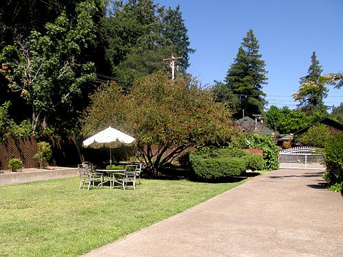 Large, spacious single family 4bd/4bath home, currently occupied as primary residence, previous profitable vacation rental, above flood zone. Finished 1st floor separate 2 bedroom apartment (ideal for long/short term rental, B&B), 3rd floor finished attic plus separate grannie unit studio. Two rental units on rear of property, remodeled 2bd/1bath and 1bd/1bath cottage. Solar power, city water, propane gas. Huge, gated, park like garden, full sun with mature fruit trees (apples, plums, lemons, peaches, cherry, blueberry, olives, grapes, blackberries), raised vegetable garden beds, chicken coop, large garden shed, hot tub, 2 large redwood decks, large paved driveway, 3 garages. Three houses, easy walk to river beach, cinema, cafes, bar, 3 local grocery stores, basketball and tennis courts and school 5 minute walk.