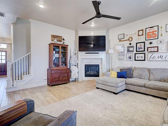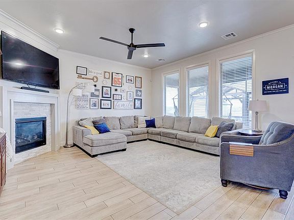 As you step inside, you’re greeted by elegant wood-look tile flooring that flows into the spacious living room. The centerpiece is a beautiful corner stack stone fireplace with shiplap accents, also large windows that flood the space with natural light. The open-concept design seamlessly connects the living area to the kitchen and dining room, creating the perfect space for entertaining.