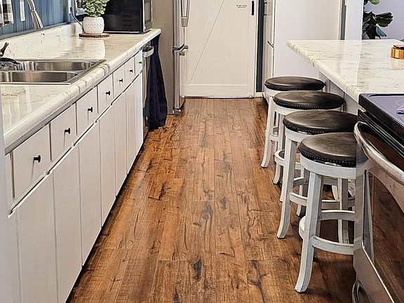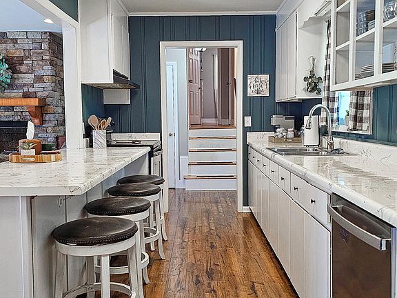 Step inside to discover a warm, inviting layout featuring a stunning stone fireplace, custom mantle, and a spacious living area perfect for relaxing or entertaining. The kitchen is a true showstopper with gorgeous marble-look countertops, updated cabinetry, stainless steel appliances, and a long breakfast bar with seating for four. Just off the kitchen, you'll find a flexible space that can be used as a separate dining room or home office, ideal for today's lifestyle.