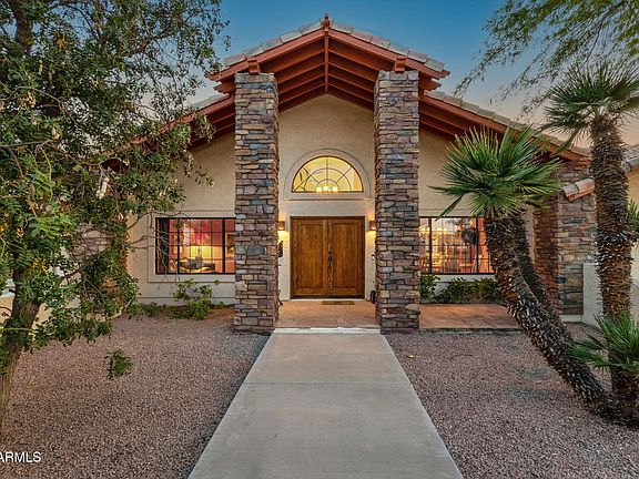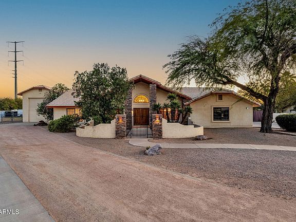 Rare find in the prestigious Circle G Ranches in the heart of Gilbert, close to all the best shopping, dining, freeway access and recreation the East Valley has to offer. Prime location on an oversized cul-de-sac lot with horse privileges and NO HOA, so bring all your toys! A 42x20 RV garage/workshop with loft and electric lift provides incredible flexibility for hobbyists, collectors, or anyone needing serious storage. Inside the home you'll find a split floor-plan with ceiling fans throughout for energy efficiency, classic fireplace and beautiful real hardwood floors. Vaulted ceilings and large windows throughout create a bright, airy feel with an abundance of natural light. Oversized primary suite has separate entrance to backyard, walk-in closet, gorgeous ensuite bathroom with a double sink vanity and separate tub/tiled shower. Chef's kitchen features gorgeous granite countertops, a kitchen island, and plenty of room for gathering. An expansive flagstone patio leads to a backyard that feels like a private resort, featuring mature landscaping/fruit trees, outdoor fireplace, an 18,500-gallon pool, heated spa, swim up barstools, a sunken built-in barbecue area and more! Unobstructed sunset and sunrise views create the perfect setting for everyday relaxation or hosting unforgettable events. The owners have even hosted multiple weddings here! This home is truly an entertainer's paradise. Horse enthusiasts will appreciate the flood irrigation, room to add a complete horse setup, and miles of riding trails accessible directly from the property. An incredibly rare amenity in such a central Gilbert location. This home is a must-see!
