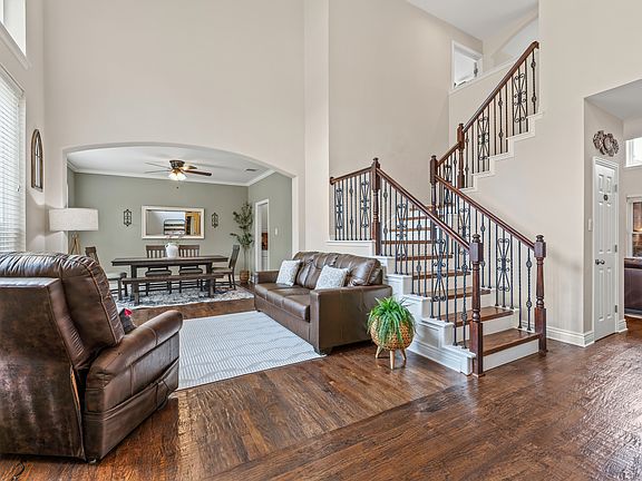 Inside, elegance abounds with hand-scraped hardwood floors throughout the main living areas, soaring ceilings, and a spacious family room filled with natural light. An updated fireplace adds a warm, contemporary touch. The kitchen has been thoughtfully renovated with new appliances, fresh paint, modern cabinet hardware, and designer lighting.