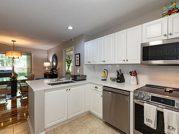 Walk right into this beautifully updated FIRST FLOOR condo... no stairs! Incredible location! Beautiful laminate flooring recently installed through living room, dining, bedrooms - No carpet! Featured updates/upgrades: Stunning modern kitchen has bright quartz counter tops, and all appliances purchased in 2021; Primary closet and laundry/pantry up fit with custom cabinets and shelving; AquaTherm HVAC and water heater installed 3/2025. The screened porch is spacious and overlooks serene community yard space that is landscaped and provides a lovely view. Community pool included as well! All appliances, including washer/dryer intend to convey. HOA dues cover water/trash/sewer. Welcome to the neighborhood!