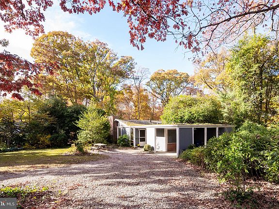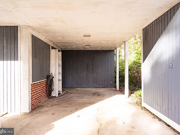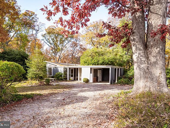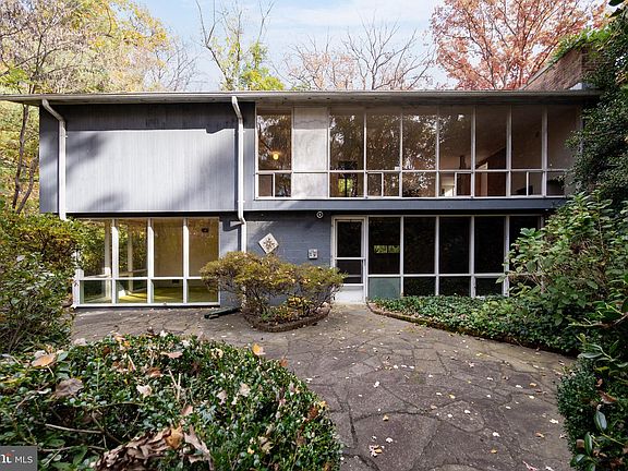 Mid-Century Modern home in the highly desirable Hollin Hills, designed by renowned architect Charles Goodman. An early addition provides a spacious foyer, step-down lounge area, and separate home office/den. Original hardwood floors extend throughout most of the main level, with floor-to-ceiling windows throughout offering abundant natural light. The open living and dining areas feature a wood-burning fireplace and sweeping views. The upper level includes two bedrooms and a full bath, while the lower level has two additional bedrooms—one with a striking corner glass wall—and another full bath, plus a large recreation room with a second wood-burning fireplace and extensive storage in the laundry/utility room. Attached carport and large shed/workshop with electrical. The property on .44 acres is enhanced by extensive slate pathways and patios amid mature plantings, creating a private, getaway-like atmosphere, backs to parkland and on premiere Marthas Circle. Sold as-is, presenting a fabulous opportunity to make this home your own design.