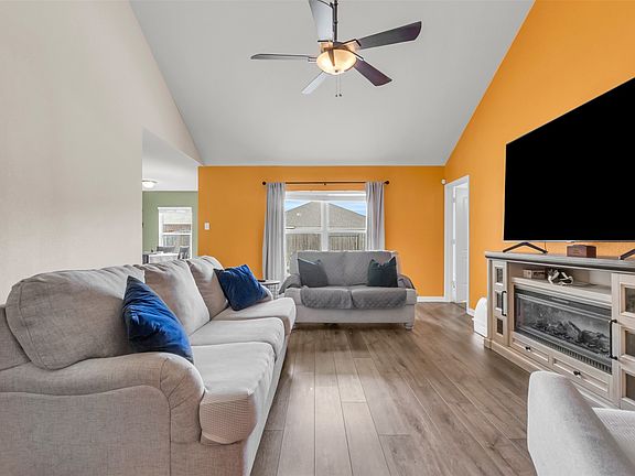 Step inside and be greeted by a bright, open interior featuring brand-new luxury vinyl plank (LVP) flooring throughout the main living areas, updated baseboards, and modern ceiling fans. The spacious living room, with its vaulted ceilings, flows effortlessly into the eat-in kitchen. This inviting kitchen features a center island, sleek granite countertops, and a pantry for all your storage needs.
