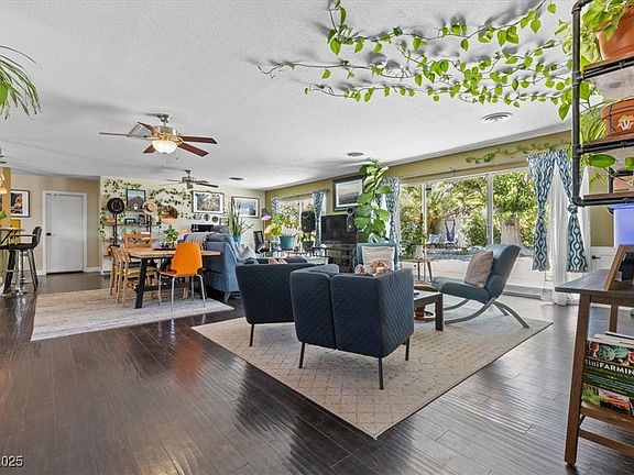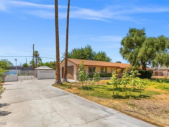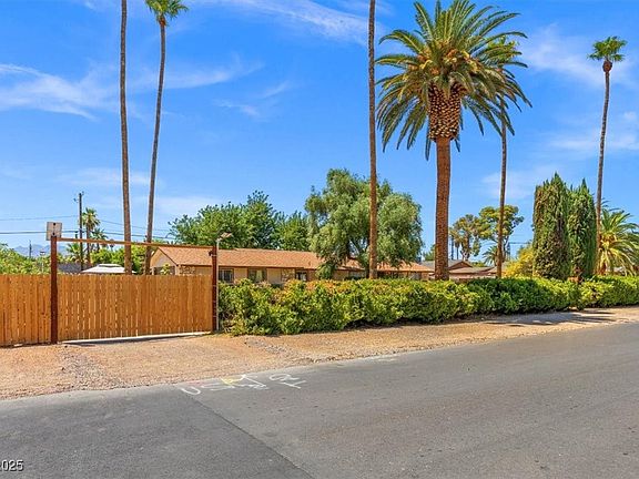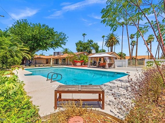 Private gated oasis on a half-acre lot. This 2,156 sq ft home offers total privacy with 6-ft tall hedges and two gated driveways—the south gate is automated with clicker access. Inside, enjoy an open floor plan with 3 bedrooms, 2 full baths, and a 3/4 “pool bathroom” with direct backyard access. The oversized 24x16 primary suite also opens to the yard. The backyard is truly resort-like, with mature trees shading a peaceful pond and waterfall, plus two gazebos (one by the pond, one by the pool) that stay with the home. A large mural adds color beside the spacious pool. The front yard features a blooming native flower meadow visited year-round by birds, butterflies, and pollinators. Includes 9 security cameras viewable from your phone, and plenty of outdoor space for gardening, entertaining, or simply relaxing. Located next to the historic Jungle Palace and Las Vegas Golf Club, with quick access to Springs Preserve and DTLV.
