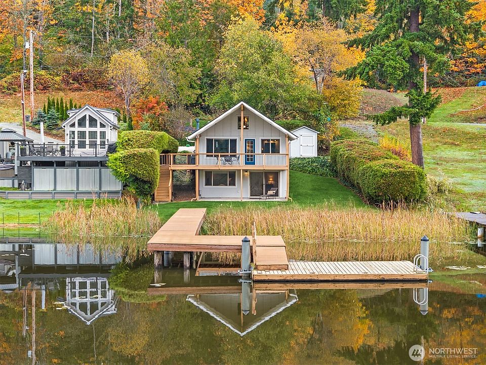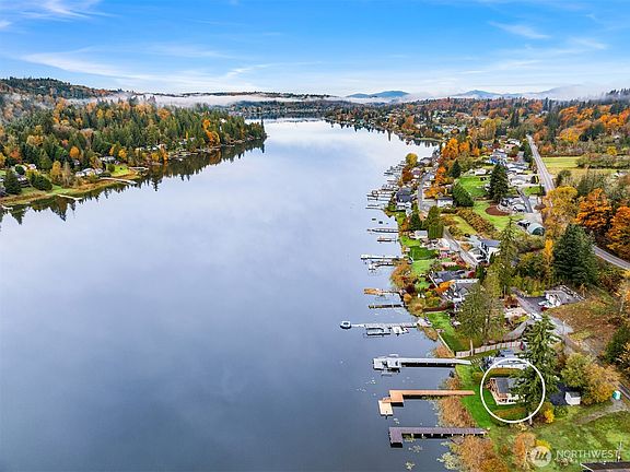 Escape to the Sunnyside of Big Lake with 60 ft of shoreline and a turn-key cabin ready for relaxation. Make lasting memories with all-day sunshine on this crystal-blue lake. Enjoy a beautiful dock for multiple boats. This large lot allows space to add a 3-car shop with a guest house above. After a day of swimming and boating, unwind on the spacious deck offering breathtaking sunsets with expansive lake and mountain views. Inside, the lower level is ideal for a game room where you can step out to the covered patio and lush, sprawling lawn. Enjoy vaulted ceilings, hardwood floors, loft, and walls of windows that invite the outdoors in. Just 8 min to amenities, 3 min to the golf course, 90 min to Seattle -your ideal lake getaway awaits!