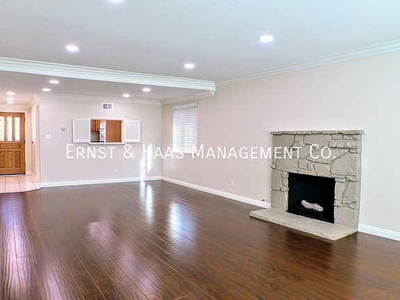 The home features a stunning gourmet kitchen complete with rich walnut cabinets, granite countertops, and stainless steel appliances, including a stove/oven, dishwasher, and microwave. An expansive kitchen dining area flows seamlessly into an open-concept formal dining space and spacious living room, which features a cozy fireplace with a stone hearth. Abundant natural light fills the living area through multiple large windows and a sliding glass door that opens to the private backyard and patio. Modern high-efficiency LED recessed lighting is installed throughout the home, creating a bright and welcoming ambiance in every room.