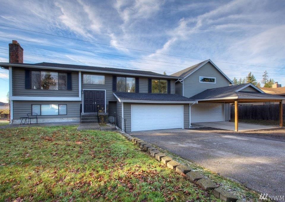 Impeccably maintained large 4 bedroom 2.5 bathroom house on private street. Recently remodeled: Outside New roof, downspouts & gutters, Inside new wiring, plumbing, interior & exterior paint. French doors open from master, & kitchen onto a lg deck. Deck built & wired for hot tub. Upgraded kitchen w ss appliances. Lower level features wet bar area, bedroom & lg bonus room. Built next to house is a permitted guest house w/ an expansive garage 960 sq ft & lg unfinished living space above 960 sq ft.