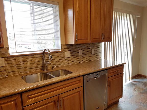 The spacious kitchen has lots of storage and features beautiful granite counters, tile floors, wood cabinets and updated appliances, including dishwasher.