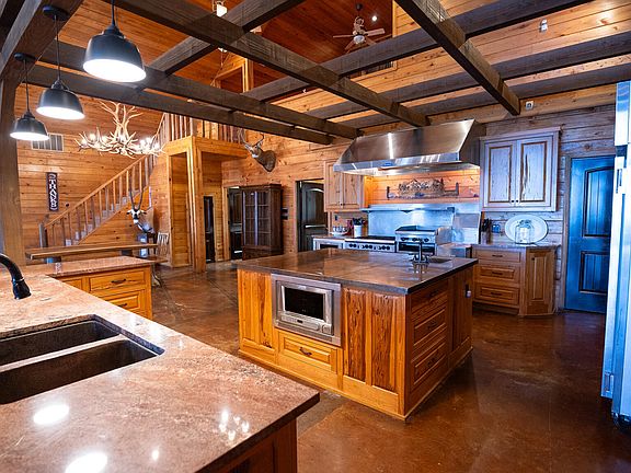 The kitchen continues the communal feel. Completely integrated with the den and fireplace area, the kitchen features a commercial-grade six-burner range, flat-top griddle, broiler, double ovens, deep fryer, multiple coolers and refrigerators, a double sink, hand-washing sink, and a high-capacity ice maker. The layout supports large gatherings, guided hunts, or family events with ease.
