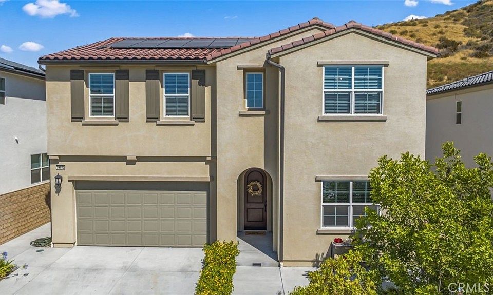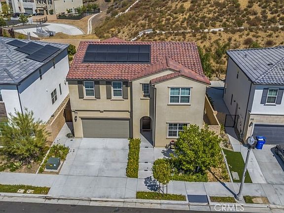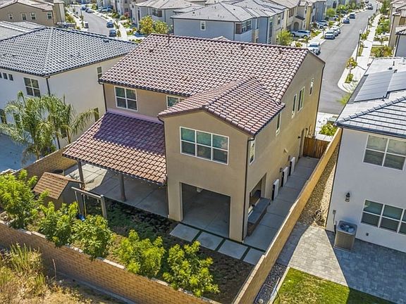 NO MELLO ROOS! This nearly new 5 bedroom, 4 full bathroom executive home with over $100,000k in upgrades is located off of Plum Canyon and Skyline Ranch in the GATED Victoria at Toll Brothers community. This beauty has one bedroom - perfect for a guest room or office - and one full bathroom downstairs. The light and bright kitchen has quality white cabinets that extend to the ceiling with unbelievable storage, quartz countertops, an enormous island with seating, stainless appliances and an upgraded hot water pot filler above the stove. The kitchen opens into the dining area and oversized familyroom complete with a gas fireplace. The entire lower level has gorgeous wide wood plank style luxury vinyl floors and there are ceiling fans in every room and living space. Upstairs is an open loft or second familyroom and 4 more bedrooms. The primary bedroom is enormous with a sizable attached retreat and unobstructed hillside views. The primary bathroom has a large upgraded soaker tub, a double sink vanity, additional linen cabinets for storage and a large walk in closet. There are 3 additional upstairs bedrooms - one with a full ensuite bathroom while the other two bedrooms share a hallway full bathroom with double sinks. The laundry room with sink and counter, along with two large hallway linen closets, are also upstairs. Front, back and side yards have been professionally landscaped and hardscaped with no expenses spared. Step outside the kitchen through the enormous slider and enjoy entertaining in the large private yard. The backyard is shaded with a custom built solid covered patio spanning the entire back of the house with built-in ceiling fans. Under the patio cover is an outdoor chef kitchen with a built-in BBQ, flat top grill with ample food prep space. The yard also has a custom built playhouse, grassy area and a gated dog run on side yard with house access.The 2 car garage is has finished wall, high ceilings, a tankless water heater, an upgraded 220v outlet and multiple ceiling storage racks. The kitchen entrance from the garage makes bringing in groceries so convenient. The home is equipped with super low lease solar and an owned Tesla battery system. Nearby amenities include shopping, restaurants, the 8 acre Plum Canyon Community Park, hiking trails and the HOA includes a resort style rec center, pool, spa, BBQ and cabanas.