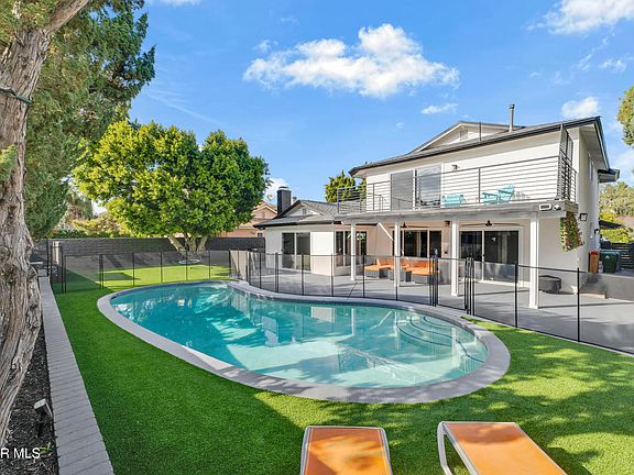 Escape to your own private paradise! This meticulously renovated TRUE TURN KEY five bedroom, three bathroom Porter Ranch home offers the perfect blend of modern luxury and comfortable living! Filled with an abundance of natural light, this casually elegant home is warm, inviting and serene from the moment you arrive. The gorgeous chef's kitchen boasts a stunning oversized quartz island / breakfast bar, stainless steel appliances, a custom backsplash and ample cabinetry. The open, airy floorplan flows seamlessly from room to room connecting the kitchen to the formal dining area and spacious living room, both of which feature sliding doors (with custom automated shades!) that lead out to your beautifully landscaped backyard oasis. Two generously-sized downstairs bedrooms and a full bathroom complete the main level. Upstairs, you'll find the primary suite, a true sanctuary! Dual vanities, a chic glass-framed shower, a custom walk-in closet, automated shades and a huge secluded balcony exude sophistication and tranquility. The second floor has two additional bedrooms, each with custom closets and large windows framing picturesque views as well as an additional super stylish full bathroom with dual vanities. Relax, play and dine in the sunny south-facing backyard, featuring a sparkling pool with a convenient durable, removable fence for safety and peace of mind, a large faux-grass area and an expansive, covered patio with dual ceiling fans, ideal for year-round entertaining. Additional highlights include a romantic brick wall fireplace in the living room, ceiling fans in all bedrooms, an attached two-car garage complete with a level 2 EV charger, newer roof, water heater, air conditioning condenser, windows and doors, an upgraded 200 AMP electrical panel, an oversized driveway and abundant street parking. With nearby access to top-rated schools and parks and shopping, dining and entertainment at the renowned Vineyards at Porter Ranch, you really can have it all! Welcome home!