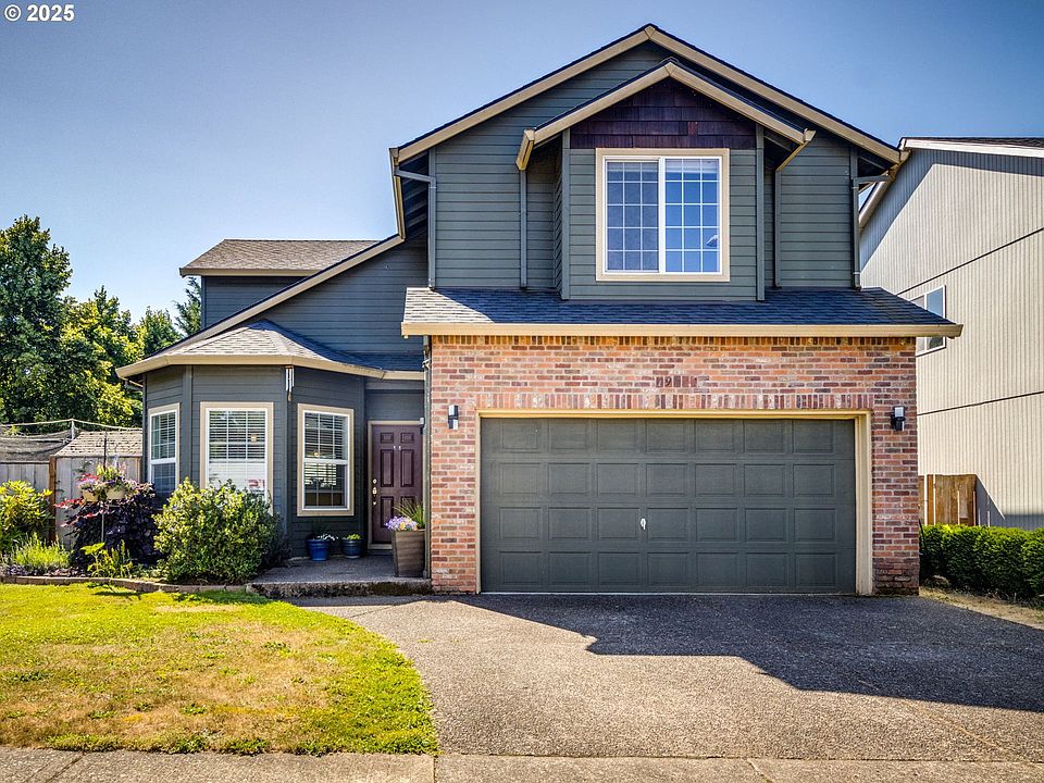 Welcome home. This four bedroom, two and a half bath home is tucked away in Tower Vista. One of Oregon City's finest established neighborhoods, inside Hampton Estates. You are greeted by a lovely brick and bay window façade with purple accents, programmable exterior fixtures, and tasteful landscaping. Step inside to find high open ceilings and lots of natural light flowing through the bay window and into living room. Pass through an arched doorway as you move through the 10'X11' formal dining room and into the kitchen. The kitchen features stainless steel appliances, high ceilings, a deep double sink, an eating bar, and a small pantry. Two large windows and a sliding glass door provide tons of natural light through the already furnished (included) breakfast nook. The kitchen is wide open to the family room which features a cozy fireplace and tons of built-in shelving for open displays and book storage. Laundry is indoors (not in the garage) across from a half bath on the lower level. The garage can house two cars and contains built in storage features and a work bench. Through the hallway and up the stairs you will find four bedrooms and a bedroom hall that is currently personalized with a large Lego station for the brick builders out there :). The primary bedroom features two closets (one of which is a walk in closet), an accent wall with tasteful built ins, and a large primary bath with a dedicated shower. The three other bedrooms have large windows that overlook the backyard. Features of the fully fenced backyard include a patio, lots of open yard, and a tool shed to house your lawn equipment. The roof was replaced in 2021 and there is an electric vehicle charger conveniently already installed for EV owners. This home is located on a corner lot with friendly neighbors and is listed at a fantastic price so call today for a private tour.