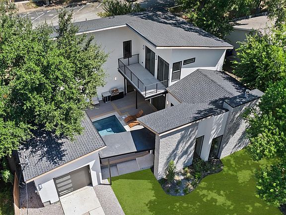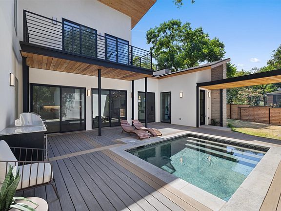 A contemporary compound in Austin's sought-after Travis Heights neighborhood, this home offers a truly unique and luxurious living experience. Private patios & balconies create personal retreats for everyone in the home while a stunning central courtyard offers a pristine pool, outdoor, kitchen, and ample patio space for al fresco dining, entertaining, and relaxing. The layout effortlessly blends indoor and outdoor living, making this home not just a place to live but a private oasis where you can unwind, entertain, and enjoy the best that modern luxury has to offer. A breezeway leads from the 1-car garage to the front door. Inside, the open floor plan features thoughtfully crafted details including wood accents, wide-plank wood flooring, and pendant lighting. Large windows and sliding glass doors bathe the space in natural light while a modern fireplace warms the living room. The kitchen is a culinary haven boasting a built-in cooktop & oven, an integrated refrigerator, a walk-in pantry, and a center island with a waterfall quartz countertop. A bedroom on the main floor is perfect for guests, featuring a private patio and an ensuite bath with a double vanity and a California walk-in closet and large shower. Upstairs, the primary bedroom is a luxurious retreat. Sliding doors lead to a large private balcony, ideal for enjoying your morning coffee. The spa-like ensuite bath features a double vanity and walk-in shower while the California walk-in closet offers ample space for your belongings. The two additional bedrooms upstairs are generously sized and share a spacious bathroom. Fully fenced in & gated, the backyard and front yard offer lush landscaping and a private and tranquil space to garden, relax, and play. Beyond your front door, a mix of eclectic boutiques, designer brands, and some of Austin's best restaurants converge on Austin's beloved South Congress Avenue.