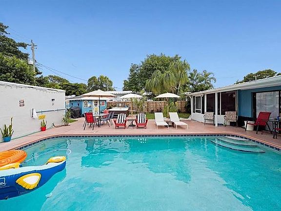 A charming 3 bed/3 bath single family home in the heart of Hollywood, one of the highlights being the huge Florida room that leads to a beautiful backyard, featuring a large pool, perfect for cooling off on hot summer days. The living room/kitchen is open plan and flooded with light. One of the bedrooms can be used as an income producing unit or as a home office/studio (it has been a successful AirBnB in the past). Improvements include: the house is freshly painted, repaired/repainted fence around the house, new walkway on the side, a water filtration system and termite bait stations throughout the property. There is a large storage shed and regular storage shed. Flat roof 2025. Tile Roof: 2010. AC 2010. Only 7 minutes to the beach. Close to shopping, Dania Pointe or Aventura Mall.