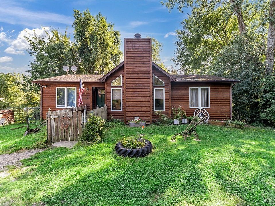 Nothing but privacy as you travel down the driveway that opens up to just under 2 acres of land and nestled behind the trees you will find a 3 bedroom 2 full bath Ranch. The combination dining/living room great room boasts cathedral ceilings and fireplace. Great working space in the galley kitchen overlooks the fenced in yard with deck off the dining area. Primary bedroom with adjacent full bath in one wing of the home with another 2 nicely sized bedrooms and another full bath in the opposite wing. Beyond the fenced in area, the woods back up to farm land. Plenty of room to build a garage and/or pole barn.