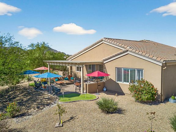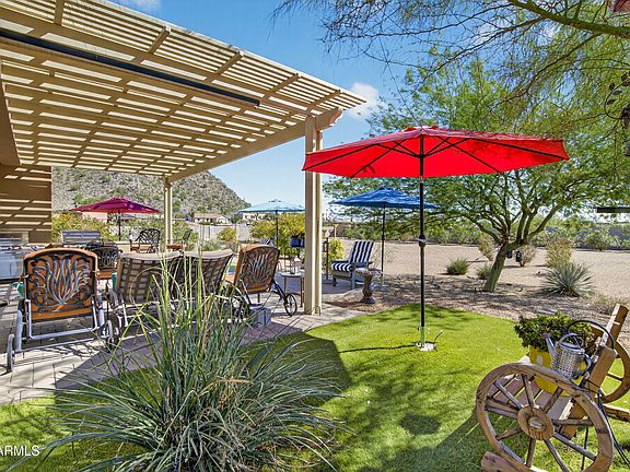 Breathtaking views of San Tan and Superstition Mountains surround this meticulously maintained, one owner, highly upgraded custom home. Restaurants & shops only minutes away. Sitting on 1.36 spacious acres, NO HOA-connected to water & sewer. NO SEPTIC! Enter inviting courtyard to an open & bright floor plan. Gourmet kitchen features granite counters, new ovens & oversized breakfast bar. Luxury travertine floors flow throughout. Sprawling back acreage, designed for entertaining & relaxation, under dark skies with mountain views. Paver patio has covered pergola, with built in BBQ island. RV gates open to low maintenance, private & secure acreage, drip irrigation & gazebo. This open space provides freedom to create your dream, whether horse property, auto shop or other business endeavors. This home features 10 foot ceilings, 4 bedrooms, 3 full bathrooms, 3-car garage and RV Gate. The oversized primary suite exits to the back patio; the bath has granite counters with dual undermount sinks, separate makeup vanity, garden tub/travertine surround, walk-in shower with designer tile and oversized walk-in closet with built-in dresser/granite top. Spacious secondary bedroom w/ walk-in closets. Other highlights include: plantation shutters, central vacuum system, water softener, RO system. The fully landscaped yard features a drip irrigation system, backyard gazebo, gutters and block wall fencing surrounding the entire property. The HVAC was recently serviced. Refrigerator, Washer and Dryer Included.