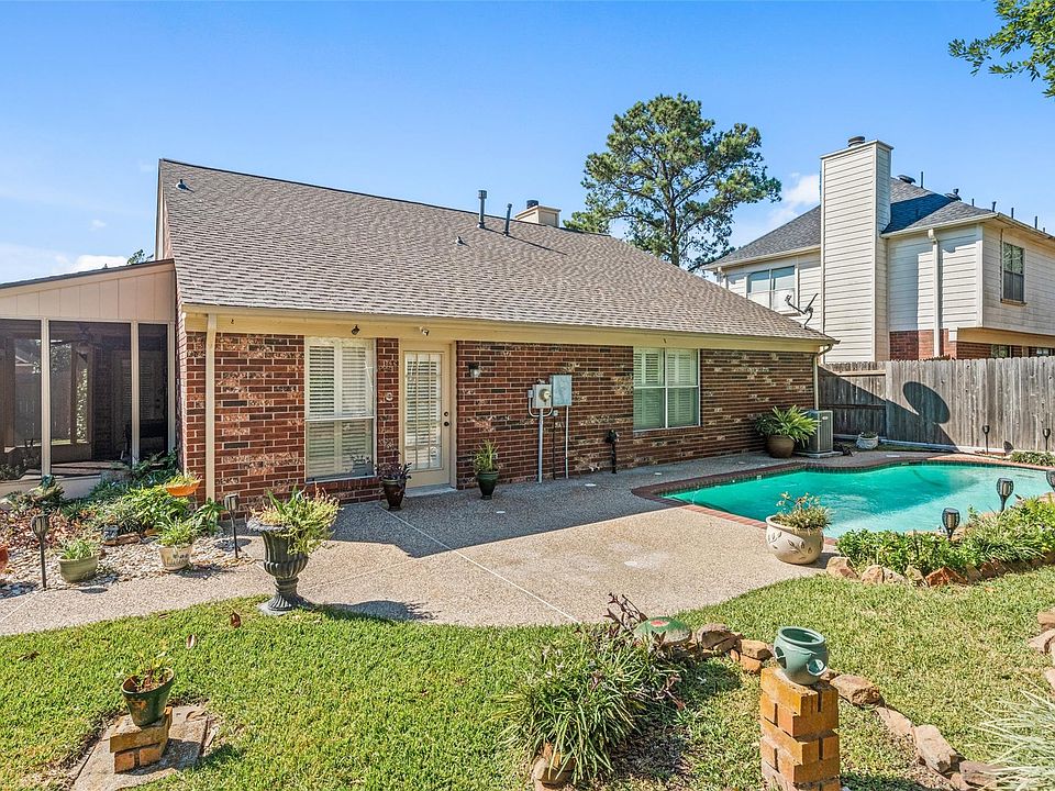 Inside, the open living area centers around a cozy fireplace—perfect for relaxing evenings or hosting guests. The spacious dining room provides plenty of space for guests. The kitchen features granite countertops, stainless steel appliances, an island, and breakfast bar. The adjoining breakfast nook offers a sunny spot to start your day. Your private primary suite includes a serene ensuite bath with a soaking tub and separate shower. Each bedroom boasts a walk-in closet for ample storage. Plantation shutters add timeless charm throughout the home. Step outside to your backyard retreat—complete with a sparkling pool and large screened-in patio, ideal for year-round enjoyment. Conveniently located near dining, shopping, and entertainment, this home truly has it all.