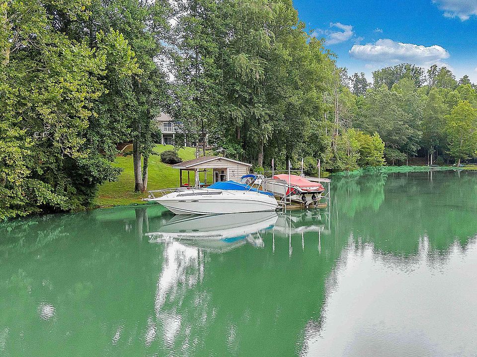 Lake Life is Calling! Custom-built waterfront home in Pirates Cove offers comfort, style & income potential as a short-term rental. Open, light-filled floor plan w/ soaring ceilings, great room w/ gas FP & gourmet kitchen w/ maple cabinets, granite, SS appliances & large island. Main-level suite w/ 2 walk-ins & spa bath + guest suite. Finished lower level adds family room, FP, wet bar, office, BR & full bath. Outdoor living shines w/ composite decking, patios & EASY walk to private dock on deep water (8+ ft, 200' shoreline). Cove ideal for swimming, minutes by boat to dining & fun. Features: Roman shower, Jacuzzi, epoxy 3-car garage, 2-zone HVAC, instant hot water, low-maint exterior. Landscaped lot offers privacy yet minutes to shops, dining, SML Airport. Luxury lake living at its BEST!