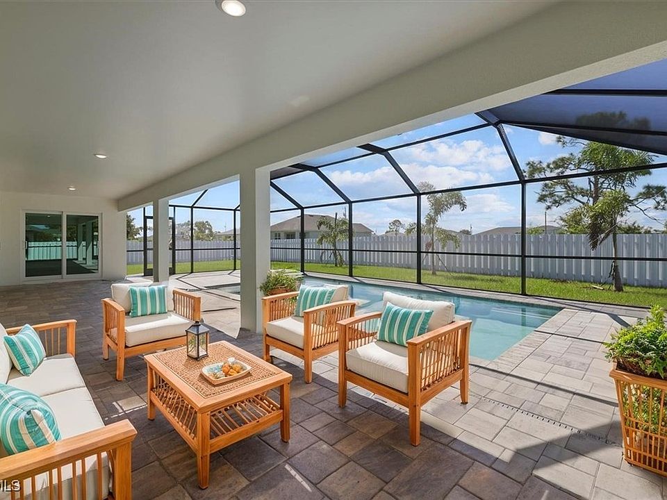 TRIPLE LOT! SPACIOUS SCREENED-IN POOL HOME WITH A PRIVACY FENCE AND DUAL PRIMARY SUITES! Welcome to the Paradise Cove Plan—a stunning, expansive retreat designed for comfort and elegance! This huge 4-bedroom, 3-bath home boasts two luxurious primary suites, making it perfect for multi-generational living or accommodating guests in style. Step inside to discover an open-concept great room with soaring ceilings seamlessly blending indoor and outdoor living. The heart of the home is the gourmet kitchen, featuring soft-close, all-wood cabinetry, quartz countertops, stainless steel appliances, and an oversized walk-in pantry—a dream for any chef! The first primary suite is a private oasis, spacious enough for a king-size bed and a cozy seating area. Enjoy direct access to the lanai and pool, plus a spa-inspired ensuite with a freestanding soaking tub and separate shower. The second primary suite is equally impressive, offering a full bath that also serves as a convenient pool bath, along with a generous walk-in closet. Outside, relax in the spacious lanai or take a dip in the heated pool, perfect for year-round enjoyment. Built by a trusted local builder, this home offers incredible value in Cape Coral with impact windows for added security and lower insurance costs, no flood zone offering peace of mind and savings, and a 10-year structural warranty for long-term confidence. This is The Paradise Cove Plan.