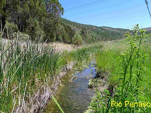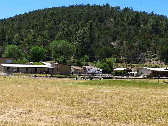 Work & play at 7,500' elevation, mountain property on the Rio Penasco offers multiple homes, barns & stalls, warehouse, water. Three single level homes with garages. 60'x40' heated warehouse has 20'ceilings, walk-in vault, office, bath. 4 1/2 Acre ft of water from Penasco, irrigation system was installed by Corps of Engineers. Equipment sheds, RV shed, hay barn, 9 stall barn, corrals, round pen, green house. Water storage. Flats entirely pipe fenced, cross fenced. Borders Ntl Forest on mountain side.
