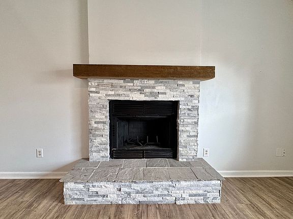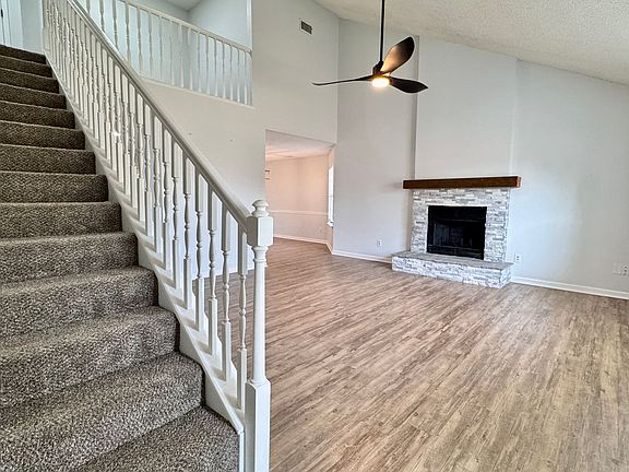 Inside, you'll find a roomy living area with high ceilings and a wood-burning fireplace. The kitchen offers stainless steel appliances and a clean, modern feel. Enjoy meals in the formal dining room or the eat-in kitchen.