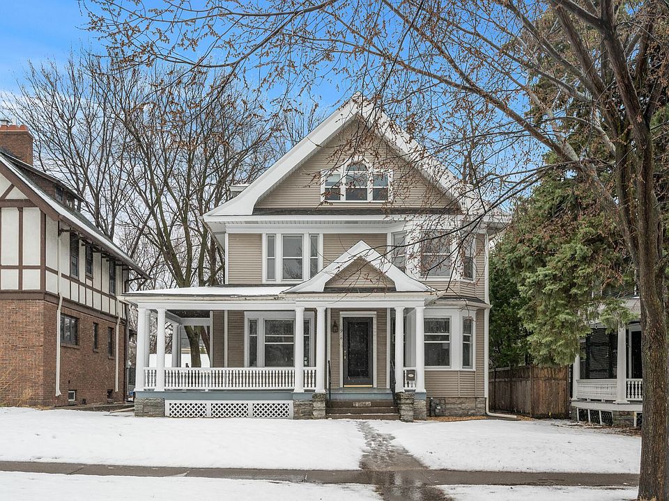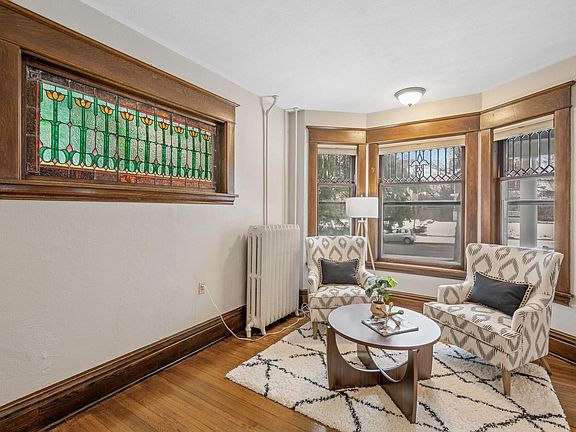 Upstairs, the stained-glass-accented stairwell leads to three generous bedrooms, all with abundant closet space. The updated main bath, complete with a classic clawfoot tub, connects to a bright three-season porch with stunning natural light and backyard views. Head up one more level to the private primary suite, where soaring vaulted ceilings, original beams, a fireplace stack, and charming alcoves create a cozy retreat. The ensuite bath and walk-in closet complete this space.